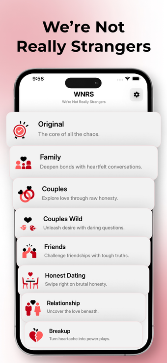 La struttura del gioco include modalità come il Core Game, ideale per testare la conoscenza tra amici, e varianti per coppie e famiglie, progettate per rafforzare i legami. Con domande che spaziano da argomenti leggeri a questioni più profonde, il gioco promuove un'atmosfera di apertura e vulnerabilità. Were Not Really Strangers non è solo un passatempo, ma un vero strumento per connettersi e comunicare, rendendo ogni incontro un'opportunità per esplorare emozioni e esperienze condivise.
